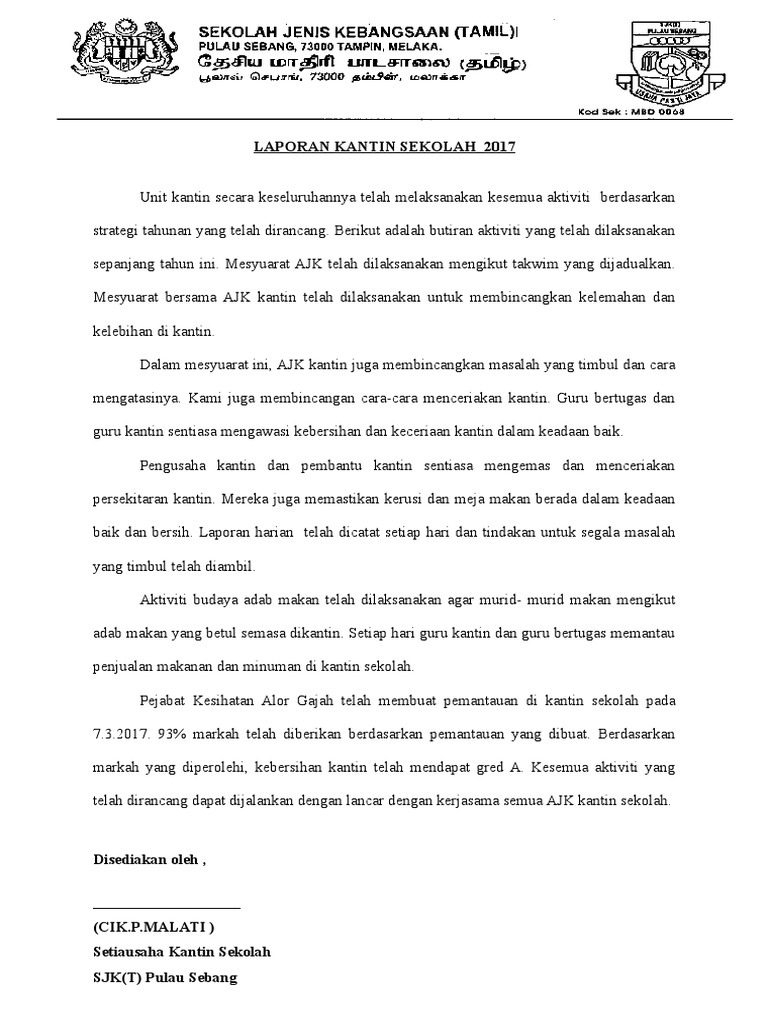 Doc Laporan Bulanan Prestasi Kantin Sekolah Ong Guat Lin Academia Edu